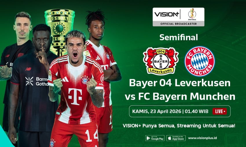 Jadwal Bayer 04 Leverkusen vs FC Bayern München Ke DFB Pokal 2025/26 Hari/Tanggal: Kamis, 23 April 2026 Jam Tayang: 01.40 WIB Channel: V+ SPORTS (SOCCER)