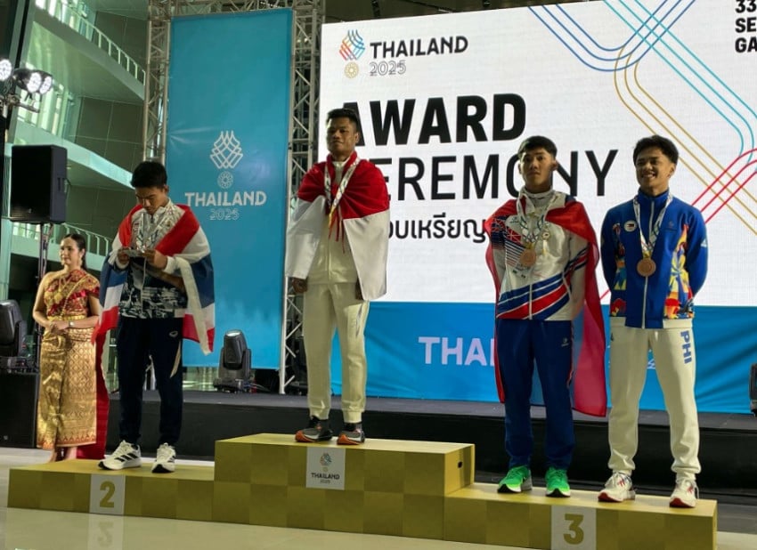 Upacara penyerahan medali nomor sanda kelas 65kg putra cabang Aktivitasfisik wushu Di The Government Complex Building C, Thung Song Hong, Lak Si, Bangkok, Thailand, Senin (15/12/2025) (Foto: NOC Indonesia)